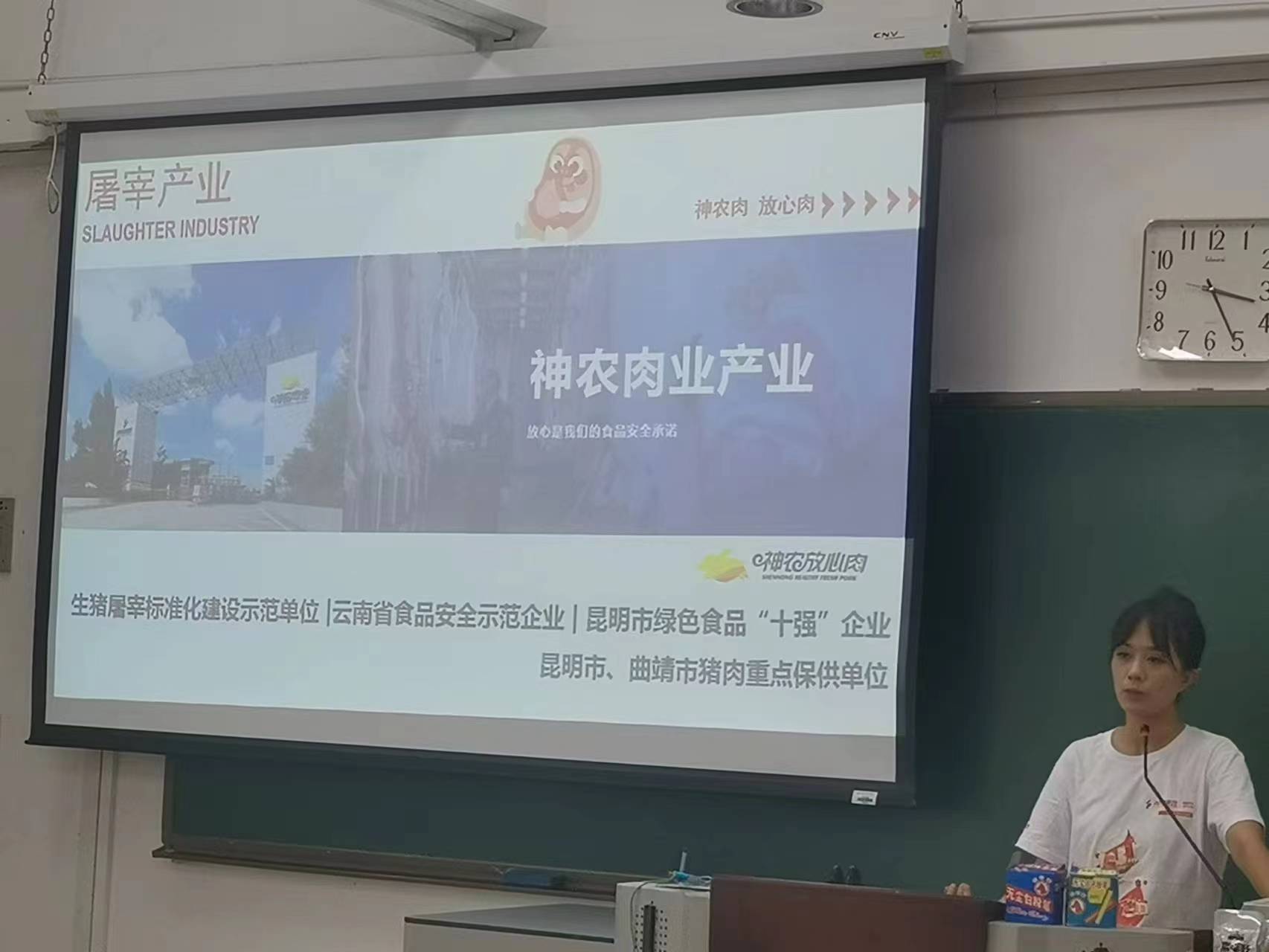 首先,孙女士播放了神农集团的校园招聘宣传片。宣传片从养殖场选址标准、生产加工和流水线等方面,为同学们呈现了神农集团的基本情况。神农集团是云南省首家上市的农牧企业,集饲料生产、生猪养殖、食品加工和屠宰加工于一体的国家重点龙头企业。然后,孙女士引出了神农集团的企业文化核心“心中有爱,开花结果”,并从对人的爱和对动物的爱两个方面简要诠释了企业文化。