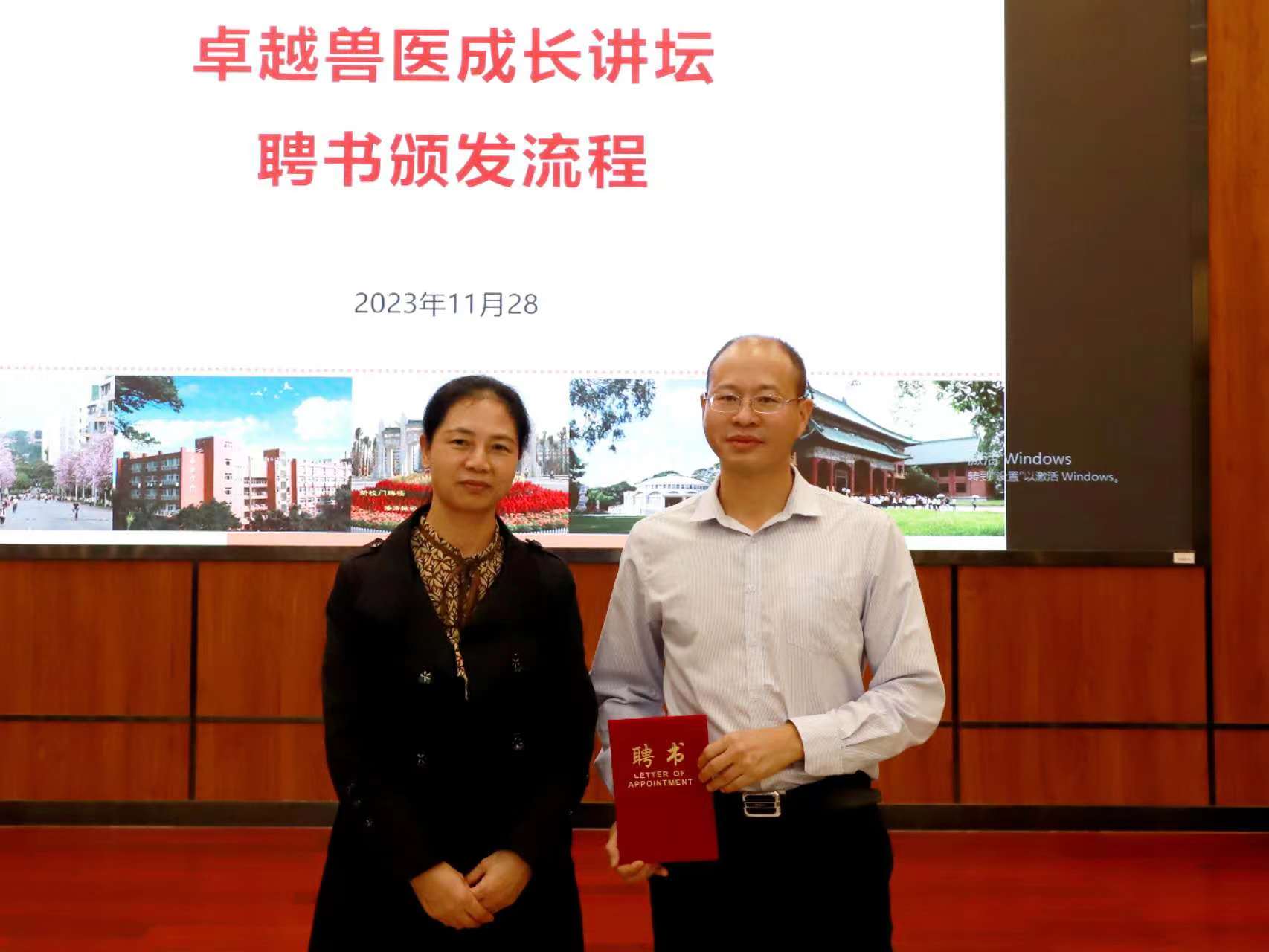 11月28日下午,第三期卓越兽医成长讲坛于伟德国际1496备用101报告厅顺利召开。本次讲坛邀请了广东省动物疫病预防控制中心副主任卢受昇校友为学生做”兽医在生态安全中的担当“为主题的报告。伟德国际1949始于英国党委易晖副书记,辅导员傅叶琪老师出席本次报告。报告开始前,伟德国际1949始于英国党委易晖副书记为卢受昇校友颁发伟德国际1949始于英国“人生导师”聘书,诚挚感谢校友心系学院,百忙中抽空为学生做行业报告。