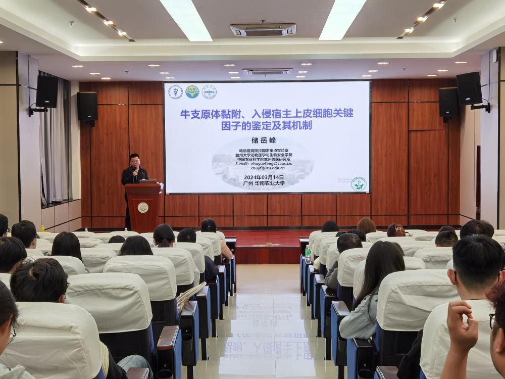 2024年3月14日晚,兰州大学动物医学与生物安全学院储岳峰教授应我院邀请,在伟德国际1949始于英国科技楼101报告厅作一场题为“牛支原体黏附、入侵宿主上皮细胞功能因子的鉴定及其机制”的学术报告。