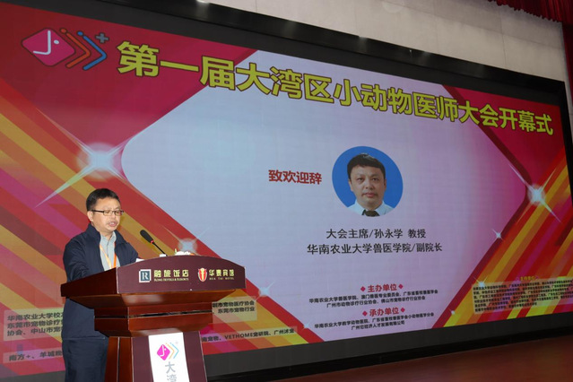 我院副院长孙永学教授为本次大会主席。他在致辞时表示,照2019年制订的《粤港澳大湾区发展规划纲要》的要求,大湾区要建设成为高质量发展的典范。我院牵头举办本次大会,是迎合了时代的发展需求和行业的发展趋势。本次大会的主题为“强化科产教深度融合,推动行业高质量发展”,共聚一个湾,共筑兽医梦。他介绍道,本次大会为期3天,报名参会人数超2500人,共设10项主题活动,各项内容安排满满、精彩纷呈,必将为大湾区宠物行业的发展注入全新的活力,并推动宠物医疗事业迈上更新的台阶。