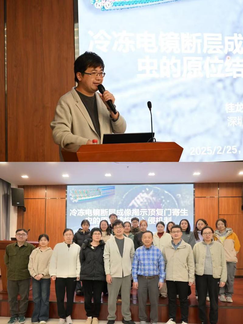 近日,深圳医学科学院生物构造和互作研究所的桂龙研究员应我院肖立华教授邀请,在学院101报告厅为师生做了题为“冷冻电镜断层成像揭示顶复门寄生虫的原位结构和入侵机制”的学术报告。